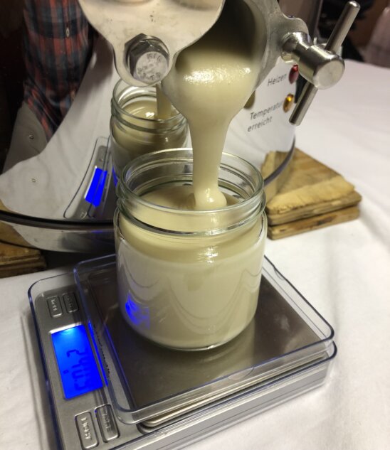 Nach wenigen Tagen wird er mit einem speziellen Honigrührer fünf bis zehn Minuten lang gerührt um die Zuckerkristalle zu zerkleinern und eine gleichmäßige Konsistenz zu erzeugen.