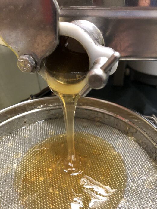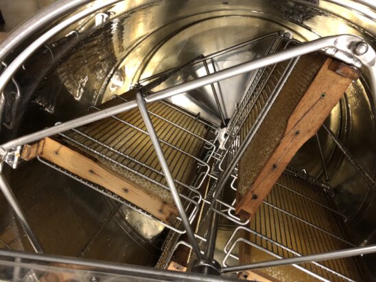 Nach dem entdeckeln der Waben werden die Rähmchen in eine Honigschleuder gehängt und geschleudert. Der süße Honig läuft nun aus der Edelstahlschleuder durch ein Sieb in einen Eimer aus lebensmittelechtem Kunststoff.